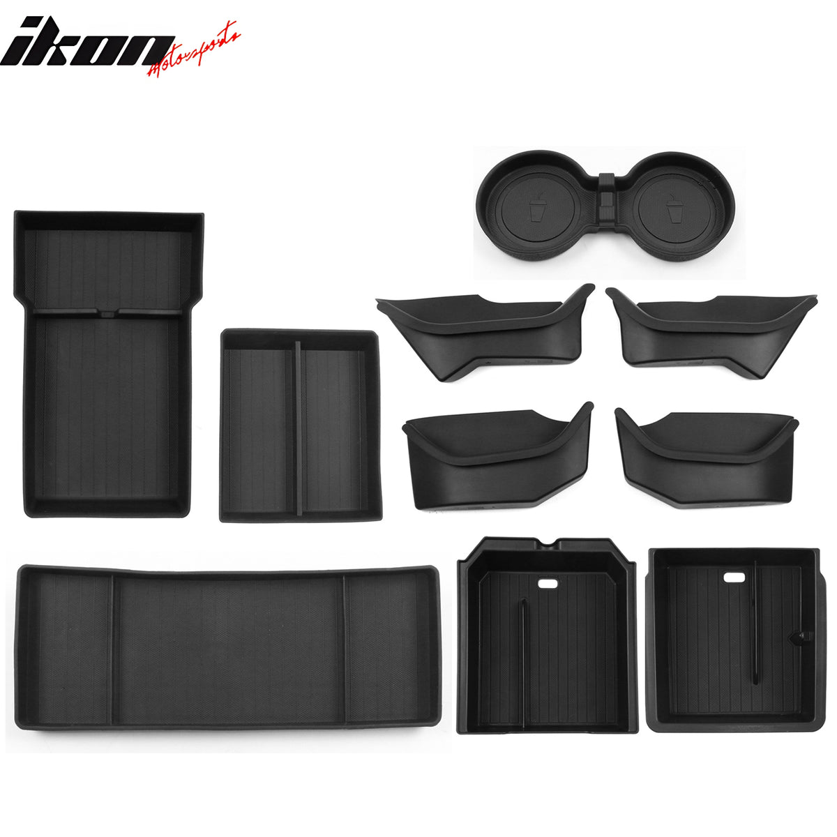 1x Set of Door Side Storage Box (4PCS), 1x Dashboard Hidden Tray, 1x Cup Holder Insert, 1x Set of Center Armrest Storage Box (Lower + Upper), 1x Set of Center Console Storage Box (Lower + Upper)
